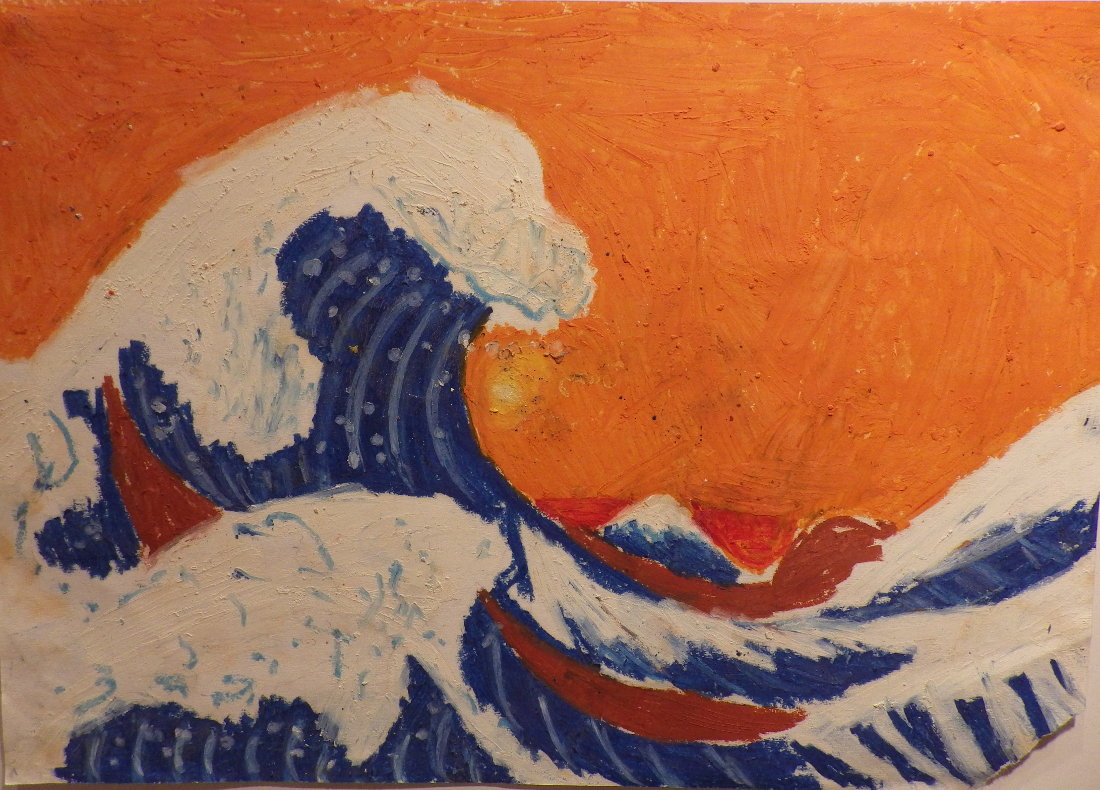 Wave View full size Drawn in 2017. Inspired by Hokusai’s “The Great Wave off Kanagawa”. Using oil pastels. It was a school project.